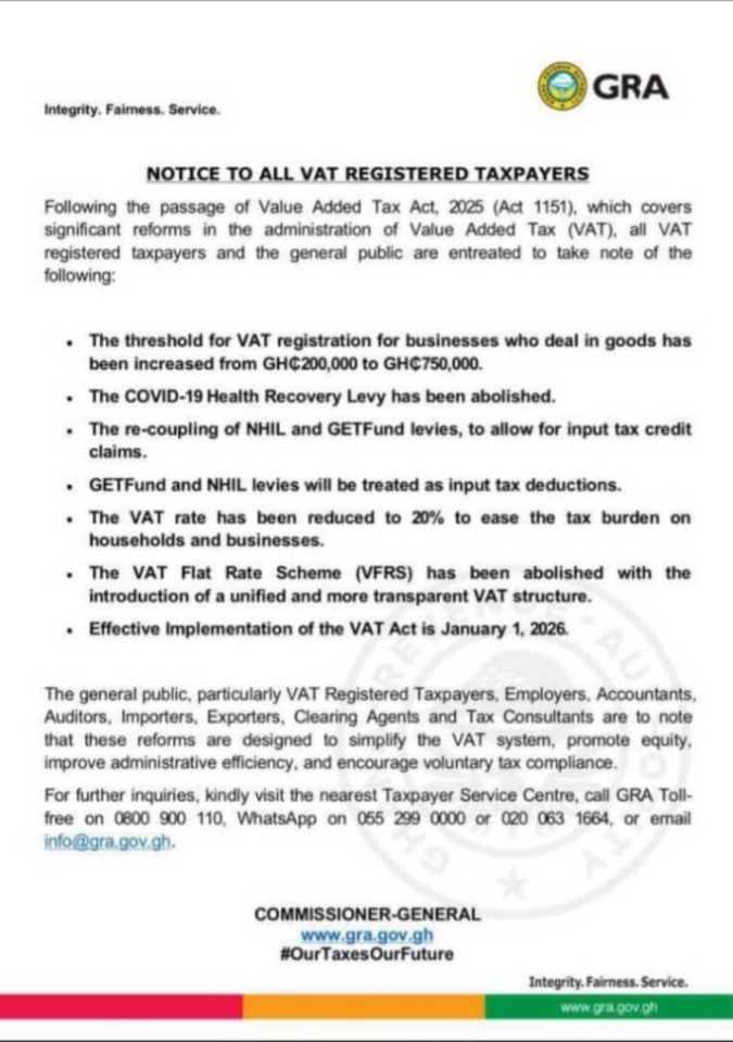 The GRA sent a notice to all taxpayers who are registered for VAT saying that the new law makes big changes that will make it easier to manage VAT, make people follow the rules, and lower the tax burden on homes and businesses.