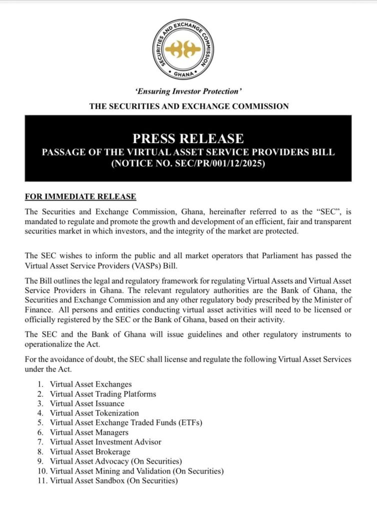 The Bill makes it legal to use, trade, and provide services in the virtual assets (including cryptocurrencies) space, among other things. “The SEC and the Bank of Ghana want to congratulate His Excellency the President, the Minister for Finance, the Governor of the Central Bank, and the Director General of the SEC for their foresight in bringing Ghana one step closer to the next phase of global finance and inclusion.”We would like to thank the VASP market operators, including the big exchanges and traders, for their huge contributions to the bill. Most importantly, we would like to thank the Honorable Isaac Adongo, Chairman of the Finance Committee of Parliament, for his great guidance and support throughout the legislative process.