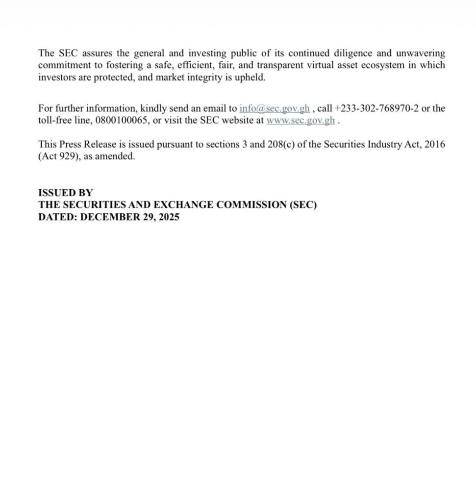 Mensah Thompson, the Acting Deputy Director-General of the Securities and Exchange Commission, made this announcement on his Facebook page on Tuesday, December 30.