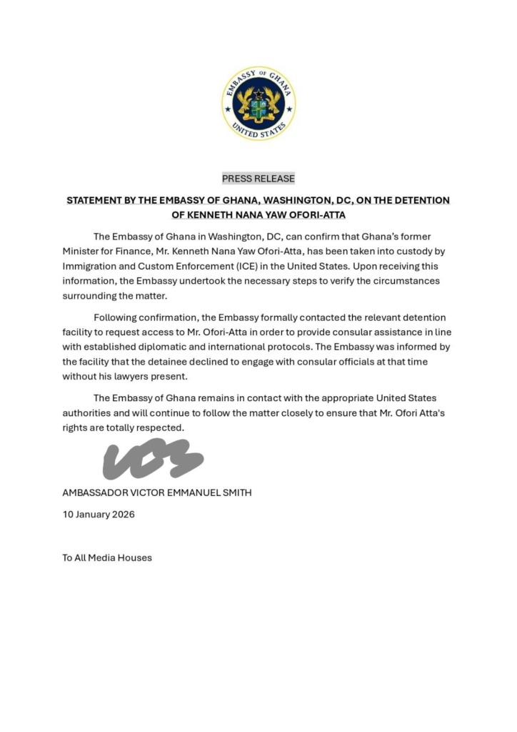 Kenneth Nana Yaw Ofori-Atta, a former Minister of Finance, has turned down help from the Ghana Embassy in Washington, DC. He said he would only talk to embassy officials if his legal team was there. This was confirmed in a press release from Ghana’s Ambassador to the United States, Victor Emmanuel Smith, on January 10, 2026. It also said that Ofori-Atta had been taken into custody by the United States Immigration and Customs Enforcement (ICE). The statement said that the embassy acted quickly to find out what happened. It said, “Upon receiving this information, the Embassy undertook the necessary steps to verify the circumstances surrounding the matter,” and that they formally contacted the relevant detention facility to request access in accordance with diplomatic procedures and the Vienna Convention on Consular Relations. However, the mission was told by the authorities that Mr. Ofori-Atta refused to meet with consular officers at that time, insisting on having his lawyers present. The statement said, “the Embassy was informed by the facility that the detainee declined to engage with consular officials without his lawyers present,” making it clear that Mr. Ofori-Atta made this decision himself and not because US authorities refused. The embassy said it is still in touch with the right US agencies and is keeping an eye on the situation to make sure Mr. Ofori-Atta’s rights and well-being are protected. It also said it would not comment on any possible legal action to respect due process. It repeated that “the Embassy of Ghana remains in contact with the appropriate United States authorities and will continue to follow the matter closely to ensure that Mr. Ofori-Atta’s rights are totally respected.”